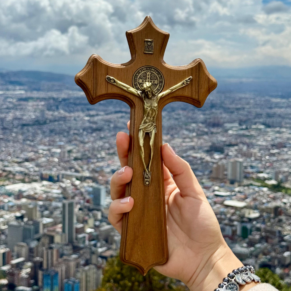 CRUZ MOLDEADA en madeira IMBUIA, madera muy valorada en Brasil por su alta calidad, durabilidad, resistencia a plaga y humedad, a su vez resalta su su distintivo color marrón con su variación de colores oscuros y matices rojizos o amarillos.