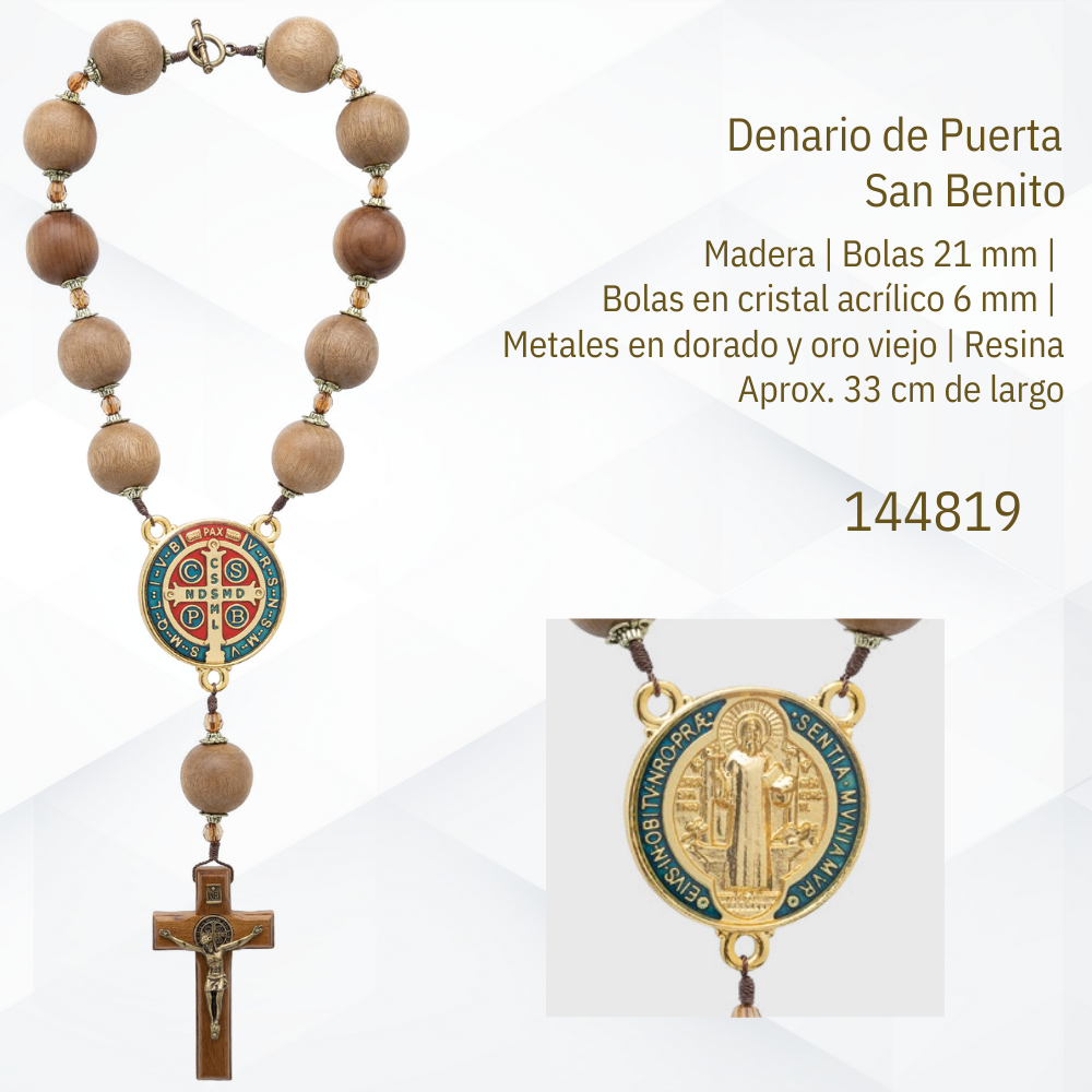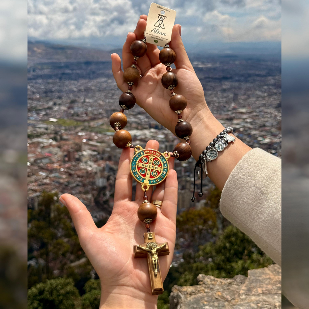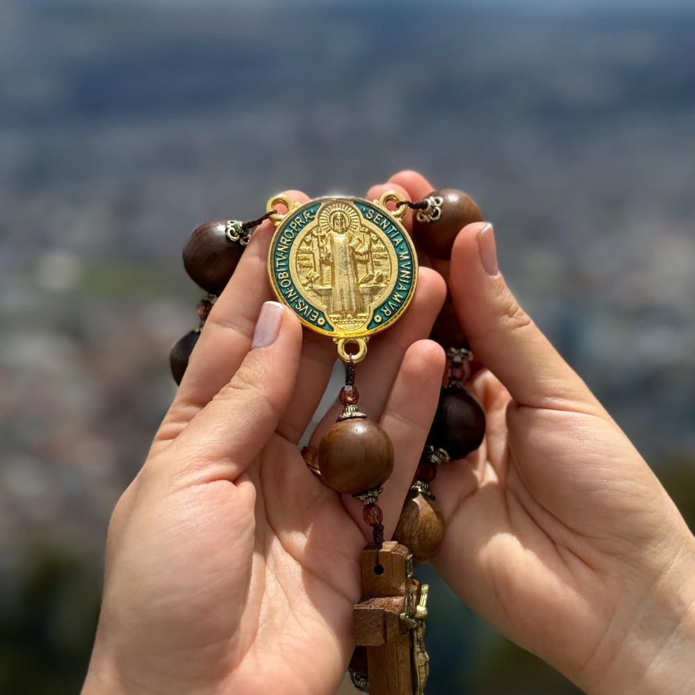 Decena de San Benito con medalla de tres baños (color oro, rojo y azul) protegida con resina de alta calidad, esferas en madeira IMBUIA, madera muy valorada en Brasil por su alta calidad, durabilidad, resistencia a plaga y humedad, a su vez resalta su su distintivo color marrón con su variación de colores oscuros y matices rojizos o amarillos.